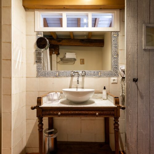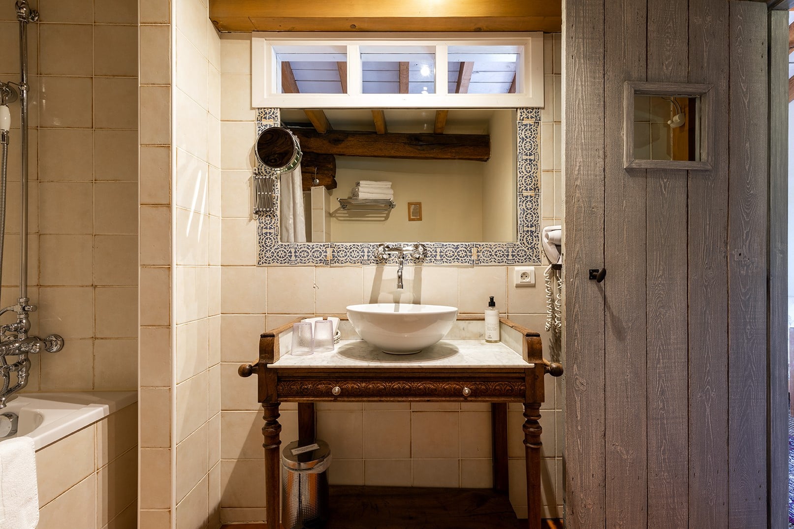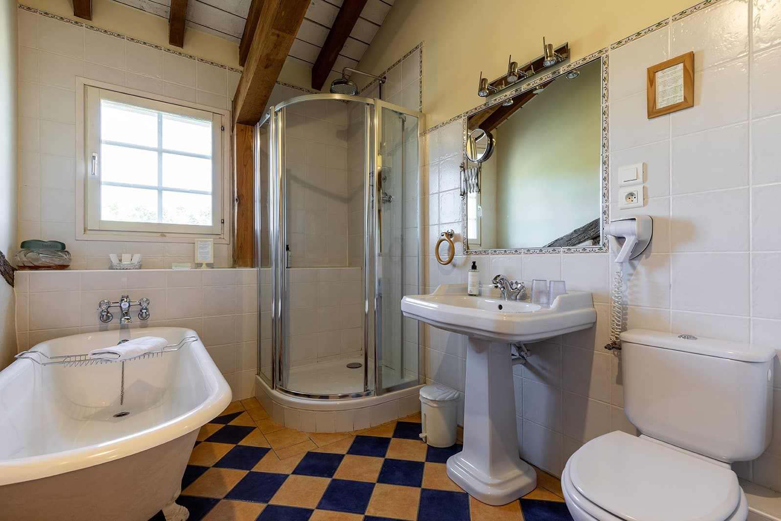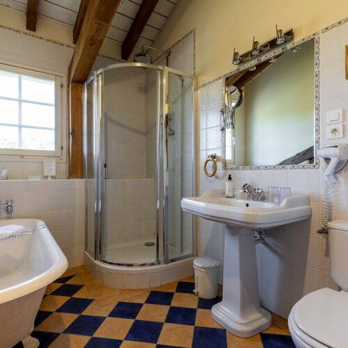Une salle de bain élégante et fonctionnelle : La plupart de nos Chambres Supérieures disposent à la fois d’une douche ET d’une baignoire, parfaites pour se relaxer après une journée d’exploration du Pays Basque.