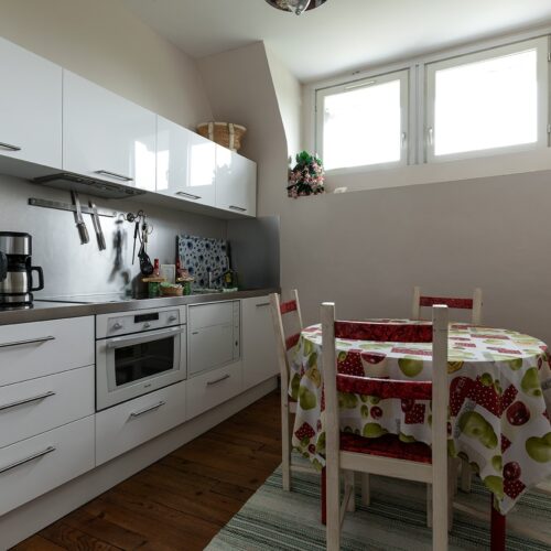 Au centre, une cuisine/salle à manger partagée permet de cuisiner et de se retrouver dans un cadre convivial. Le lieu parfait pour un séjour indépendant, entre charme historique et confort moderne, à deux pas de Biarritz.