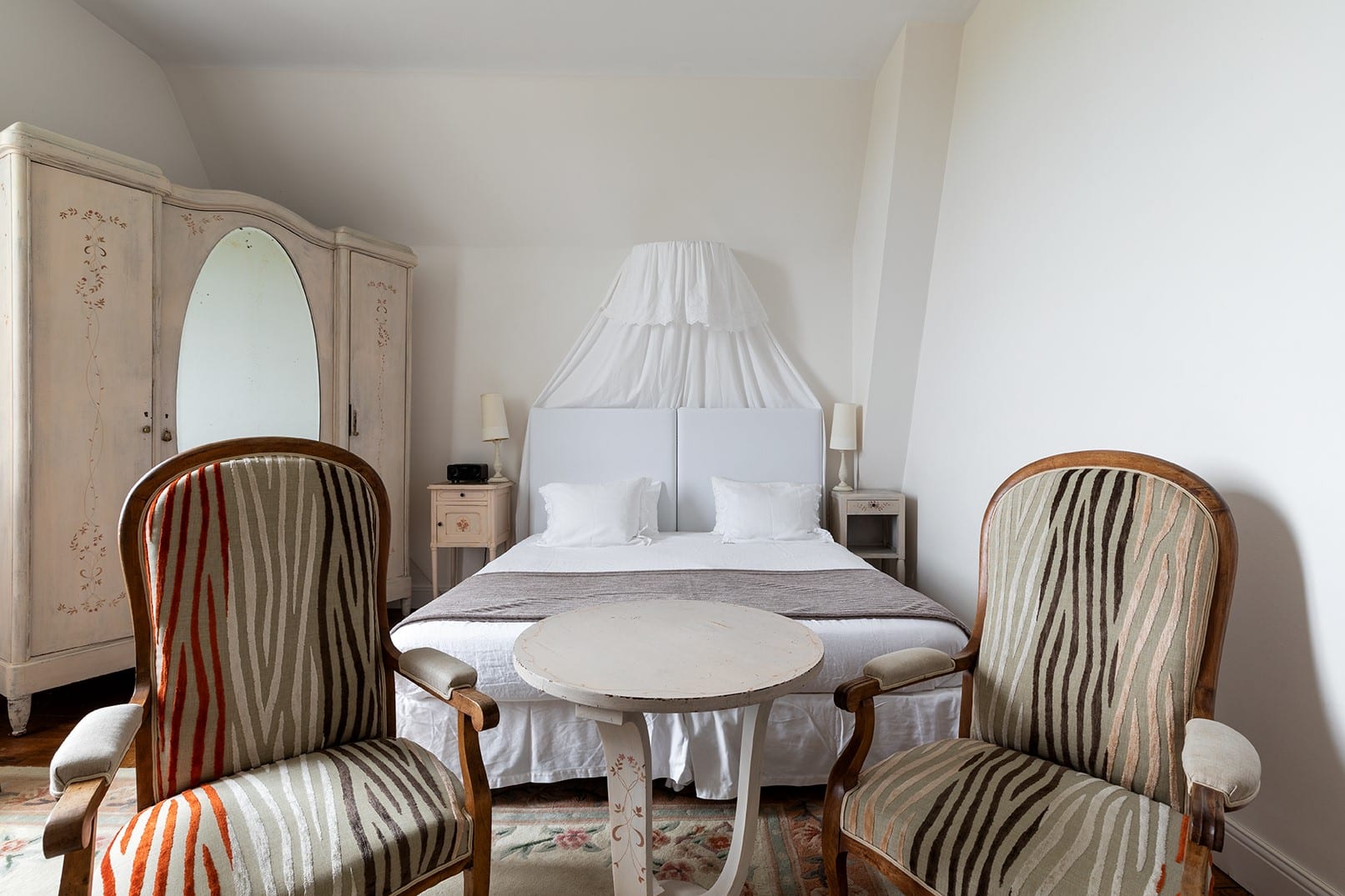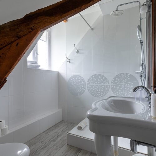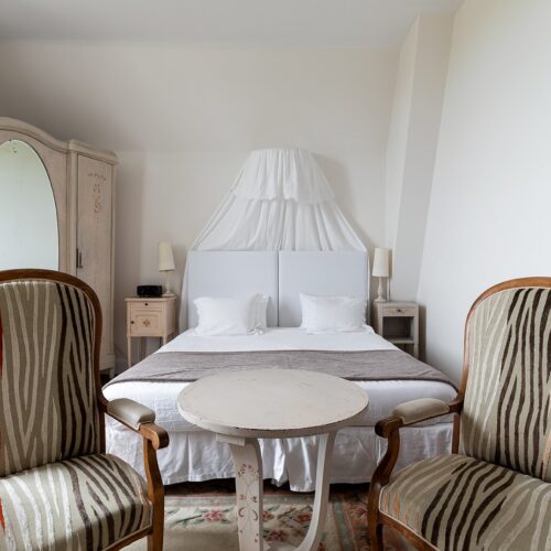 Chaque chambre dispose d’un lit king-size, d’une salle de bain privative avec douche et WC, et d’une jolie vue sur le parc.
